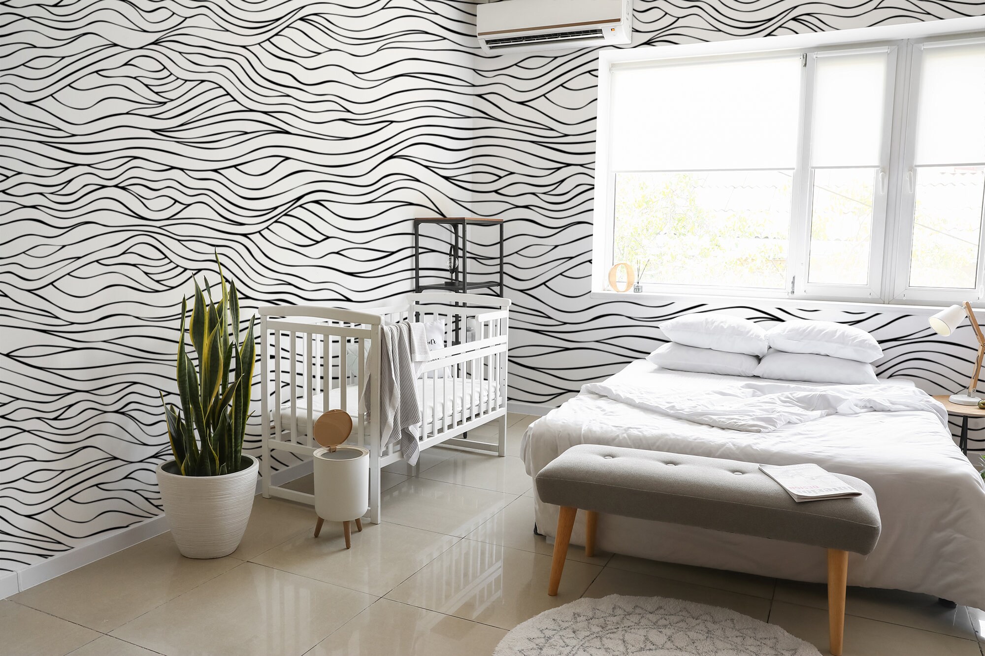 Modern Minimalist Wave Line Art Wallpaper Black And White Etsy Sweden